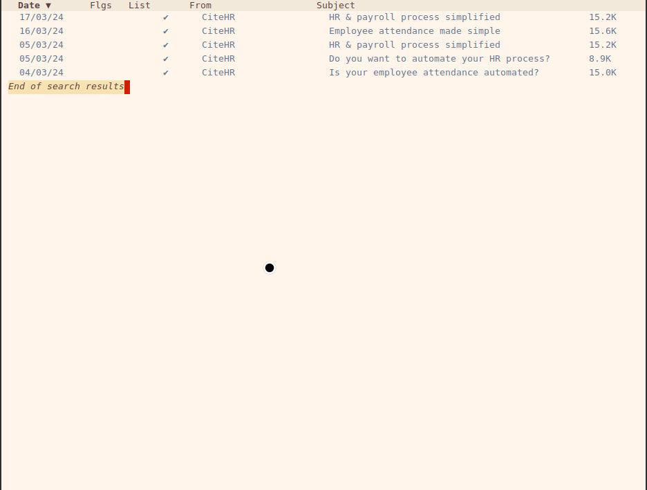 This is what my email looks like in mu4e. It’s all locally indexed which means I can search thousands of emails to find what I need quickly. Processing email is also very fast, as you can see in this example – I have the search results of a bunch of marketing emails. I open one to see if it is useful, then delete the rest of them lickety-split.