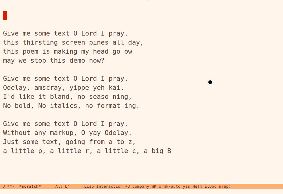 Surgical strike on text. A contrived example using bad poetry to illustrate how I can jump around in a screenful of text in Emacs, transpose words, find and replace characters, cut sections and paste them elsewhere and so on. I don’t need to touch the mouse.