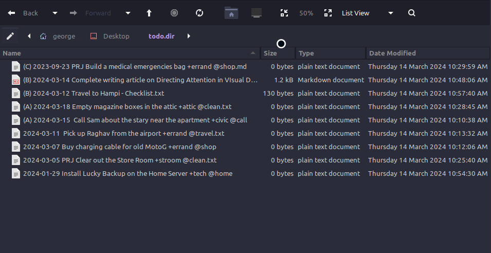 This morning, as I was ticking off items from my list, I had a moment of insight. It hit me that the solution to the problem over which I stopped using todo.txt was staring me in my face. It was right in front of me all day long. The File Manager from my Operating System.